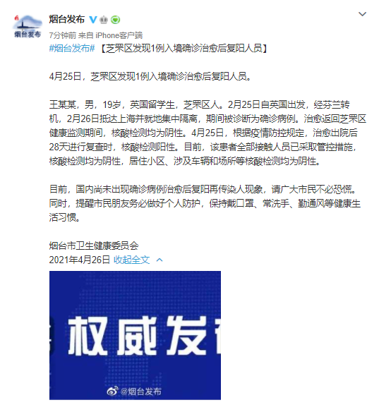 4月25日,芝罘区发现1例入境确诊治愈后复阳人员。