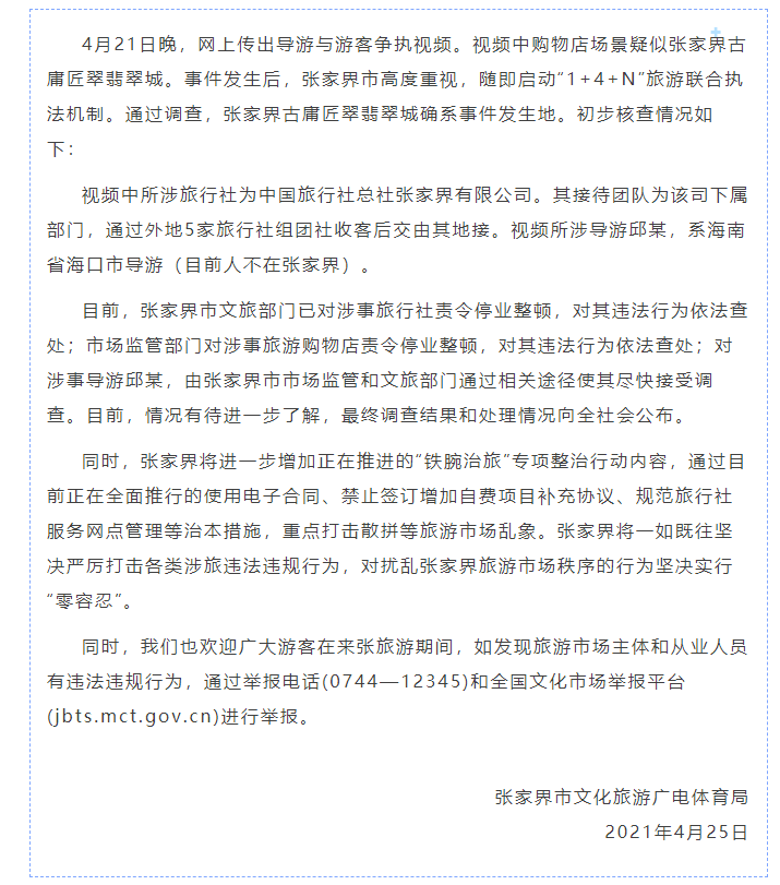 4月21日晚,网上传出导游与游客争执视频。视频中购物店场景疑似张家界古庸匠翠翡翠城。事件发生后,张家界市高度重视,随即启动“1+4+N”旅游联合执法机制。通过调查,张家界古庸匠翠翡翠城确系事件发生地。初步核查情况如下: