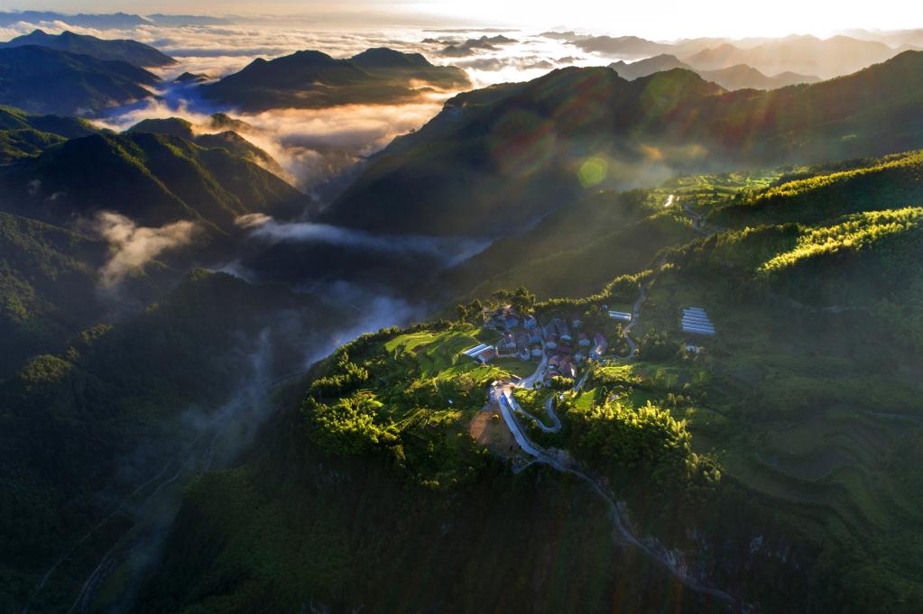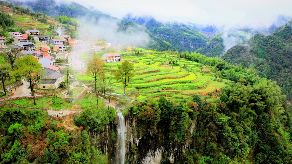 图为浙江省金华市磐安县的“悬崖村”。(无人机照片,磐安县委宣传部供图)