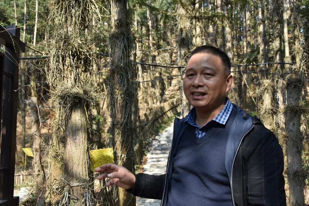 2月25日,磐安县方正珍稀药材开发有限公司总经理郑方正讲解户外人工种植石斛的经验。 新华社记者 赵悦 摄