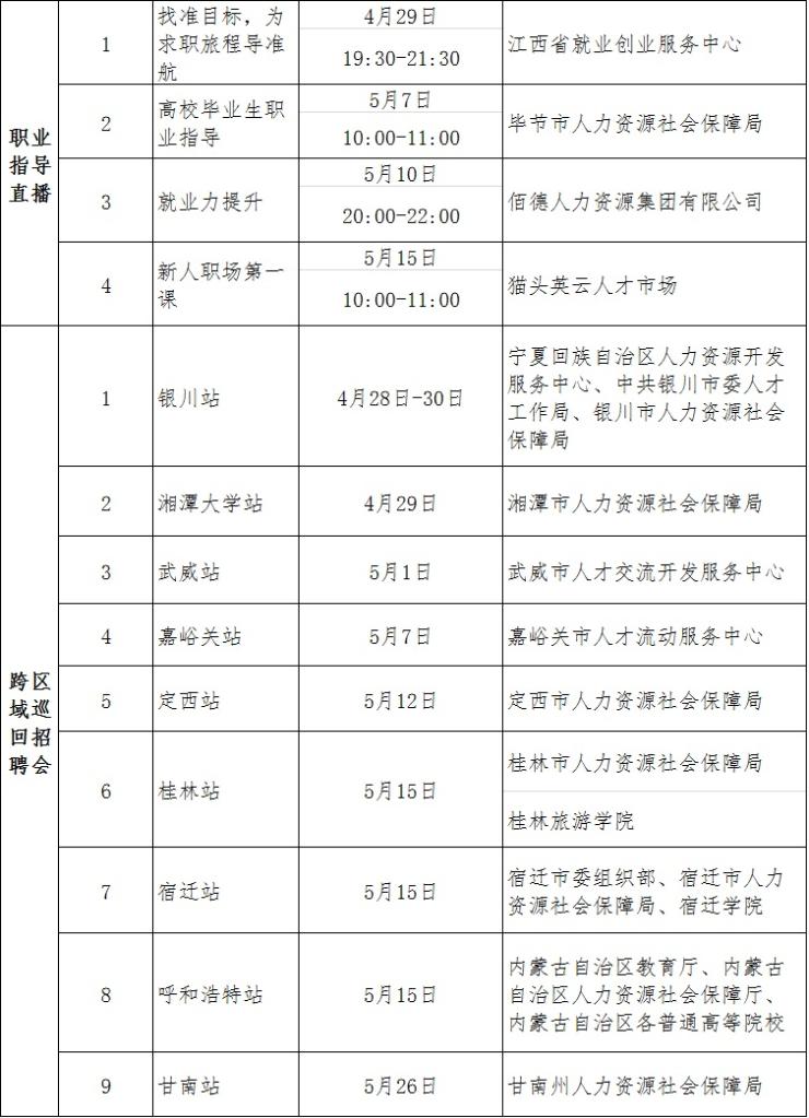 线下活动9场:举办银川站、桂林站、嘉峪关站等9场跨区域巡回招聘会,除本地用人单位外,还将邀请外省市人社部门组织用人单位组团参会招聘。
