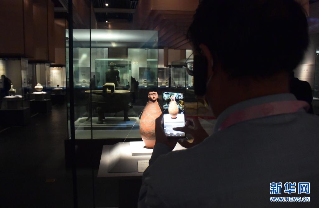 4月30日,参观者在郑州博物馆新馆内拍摄“黄河珍宝——沿黄九省(区)文物精品展”中展出的“人头形器口彩陶瓶”。新华社记者李文哲摄
