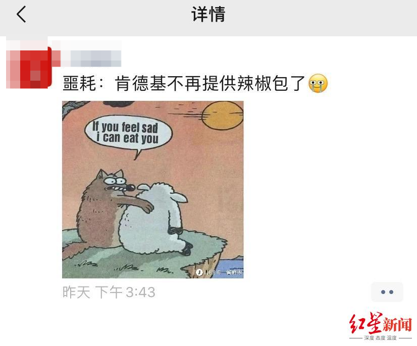 而一位无辣不欢的顾客说,辣椒包要收费,“消费者有可能会减少”,她也会考虑是否还继续在肯德基消费,“毕竟现在美食店那么多,卖炸鸡的又不止他们一家”。