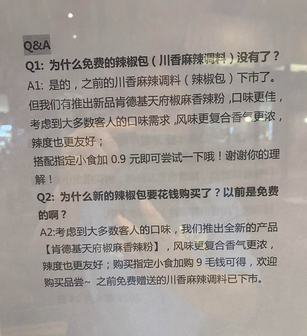 近日,有网友反映,在肯德基用餐时,餐厅不再提供免费辣椒包了,而是需要顾客花0.9元/包购买全新上市的天府椒麻香辣粉,这对无辣不欢的四川人来说,简直“要命”!