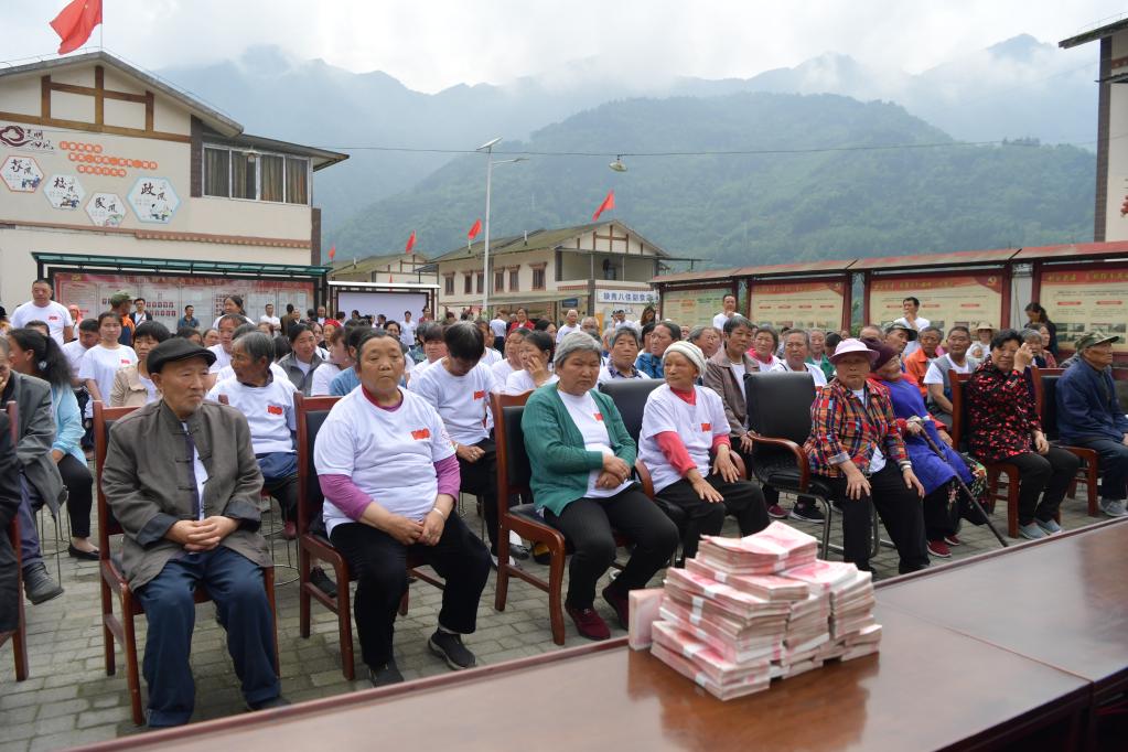 新华社成都5月12日电(记者谢佼)“又分红啦!”5月12日上午10点,映秀镇渔子溪村活动中心摆着3张条桌,31万元的现金当天要全部发放给渔子溪村1017名村民。在四川省阿坝藏族羌族自治州汶川县,这已成为这个昔日的地震灾区从废墟变身爱国主义教育基地的生动写照。