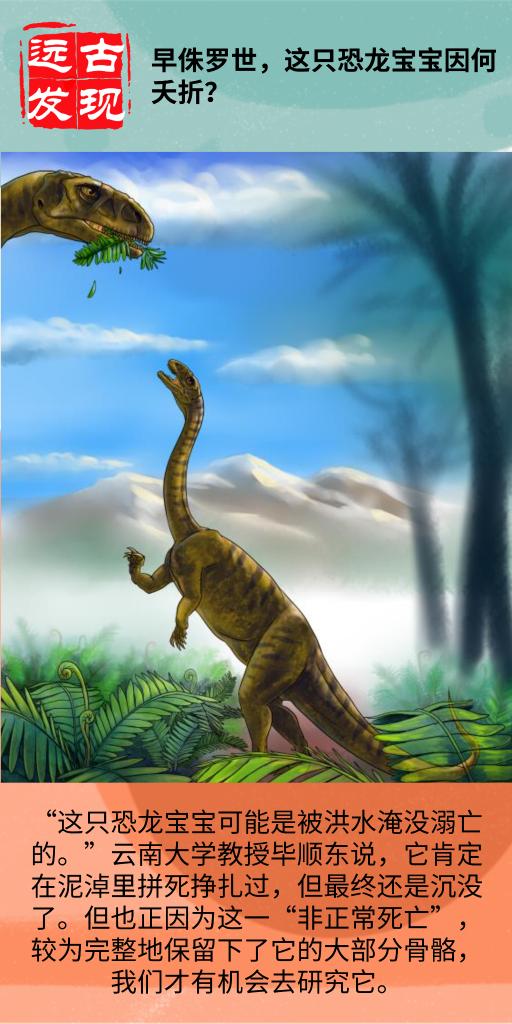 新华社昆明5月13日电(记者岳冉冉)在距今约2亿年的我国云南禄丰县早侏罗世地层中,科学家发现了一具溺亡的3岁蜥脚型类恐龙化石。该发现于近日发表在国际期刊《地质学报》上。