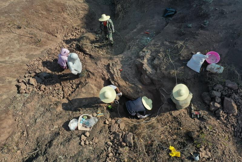 在云南禄丰恐龙化石发掘地点,研究人员正在工作。云南大学博士生李洪清 摄