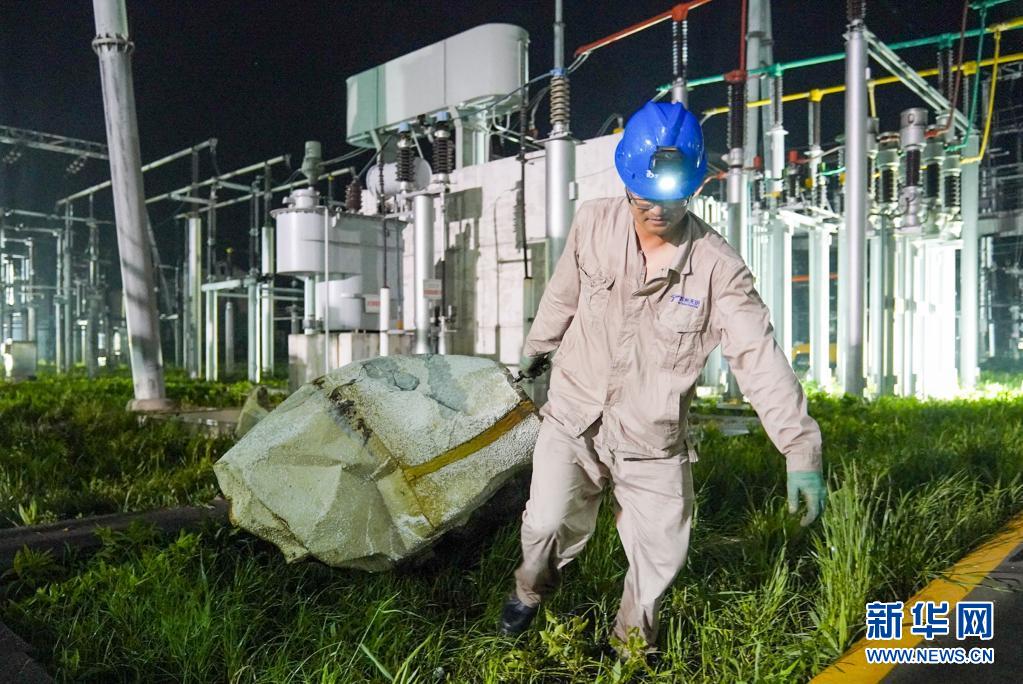 5月15日,国网苏州供电公司的工作人员在苏州市吴江区盛泽镇电力设施受损处进行抢修。新华社发