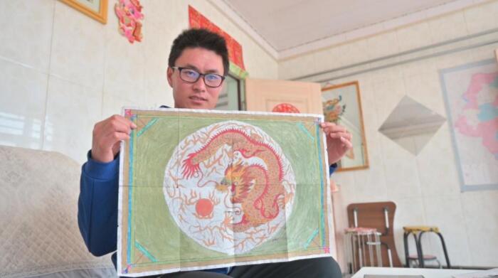 吴广明从小喜欢画画,经常在放羊时蹲在地上拿小树枝画画。在黄土地上,他描绘生活,描绘梦想。“我相信画里有我没看到过的完美世界。”他比划着说。