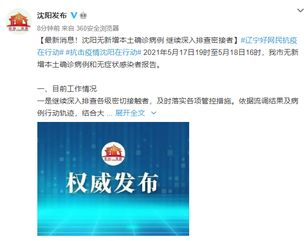 【最新消息!沈阳无新增本土确诊病例 继续深入排查密接者】 2021年5月17日19时至5月18日16时,我市无新增本土确诊病例和无症状感染者报告。