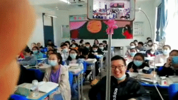 直播视频中的课堂上,同学们都开心地笑了。