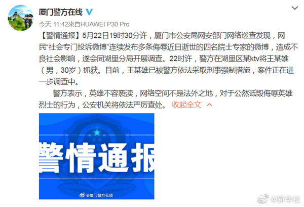 据厦门警方在线23日发布警情通报,5月22日19时30分许,厦门市公安局网安部门网络巡查发现,网民“社会专门投诉微博”连续发布多条侮辱近日逝世的四位院士专家的微博,造成不良社会影响。当日22时许,警方在KTV内将王某雄(男,30岁)抓获。目前,案件正在进一步调查中。(记者颜之宏)