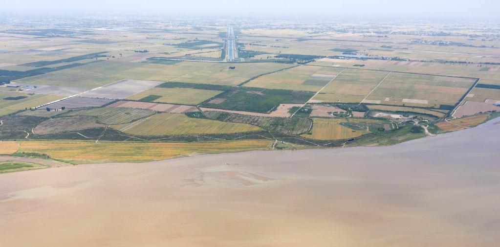 这是5月23日在河南省郑州市拍摄的南水北调穿黄隧洞出口北岸明渠,前景为黄河。(无人机照片)