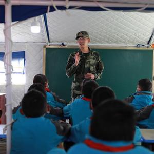 李春告诉记者,学校现有380名寄宿学生,震后没有上课场所。复课时间越来越近,武警官兵争分夺秒,很快为他们搭建了10顶帐篷教室。