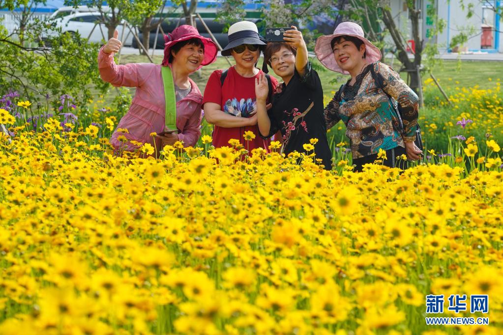 游客在元荡湖岸边花海留影(5月7日摄)。新华社记者 李博 摄