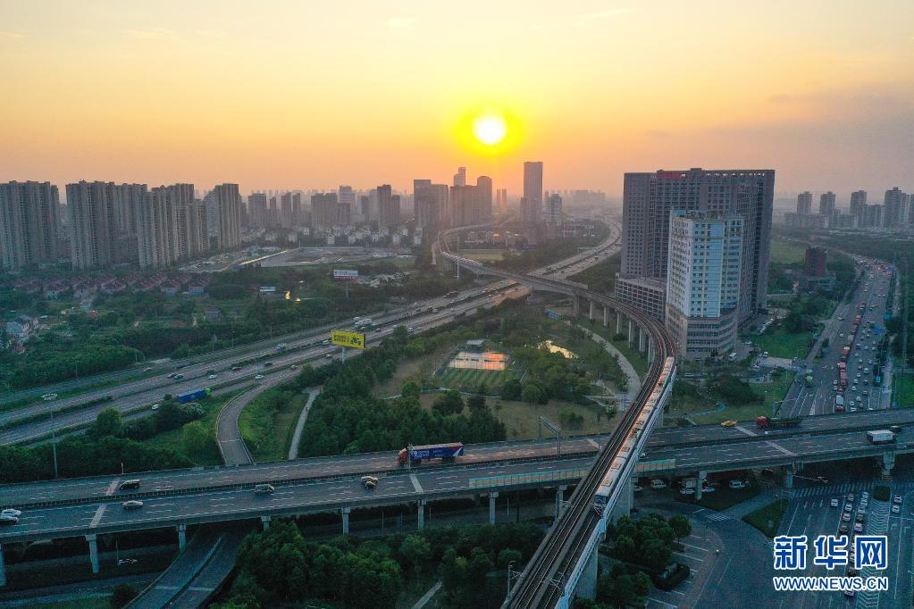 列车行驶在上海轨道交通11号线北段延伸工程花桥段(上海安亭站至昆山花桥站)兆丰路站附近(2020年8月21日摄,无人机照片)。新华社记者 季春鹏 摄