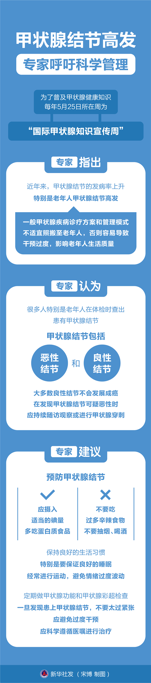 新华社长沙5月25日电(记者帅才)为了普及甲状腺健康知识,每年5月25日所在周为“国际甲状腺知识宣传周”。专家指出,近年来,甲状腺结节的发病率上升,特别是老年人甲状腺结节高发。一般甲状腺疾病诊疗方案和管理模式不适宜照搬至老年人,否则容易导致干预过度,影响老年人生活质量。