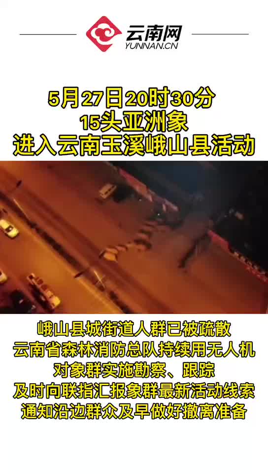 5月27日18时30分至19时20分,野象群由大坟山附近向西北方向移动。20时30分,野象群通过峨山县城熠峨路,目前在峨山县城熠峨路和昆磨高速民房附近徘徊。峨山县城街道人群已被疏散,云南省森林消防总队持续用无人机对象群实施勘察、跟踪,及时向联指汇报象群最新活动线索,通知沿边群众及早做好撤离准备。(记者 张玛睿 通讯员 杨翔宇 陈胜瑶)