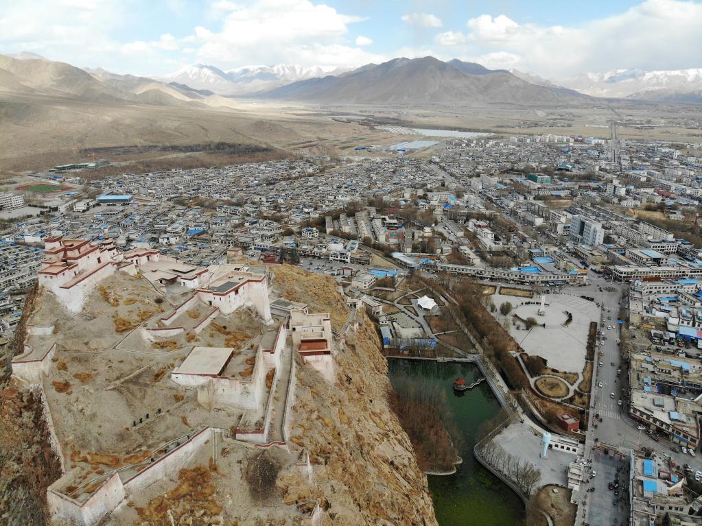 这是3月23日拍摄的江孜宗山古堡和江孜县城(无人机照片)。新华社记者 孙瑞博 摄