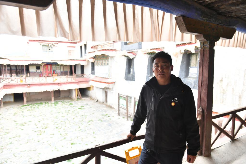 5月10日,解说员普布次仁站在帕拉庄园二楼的走廊上。新华社记者 孙瑞博 摄
