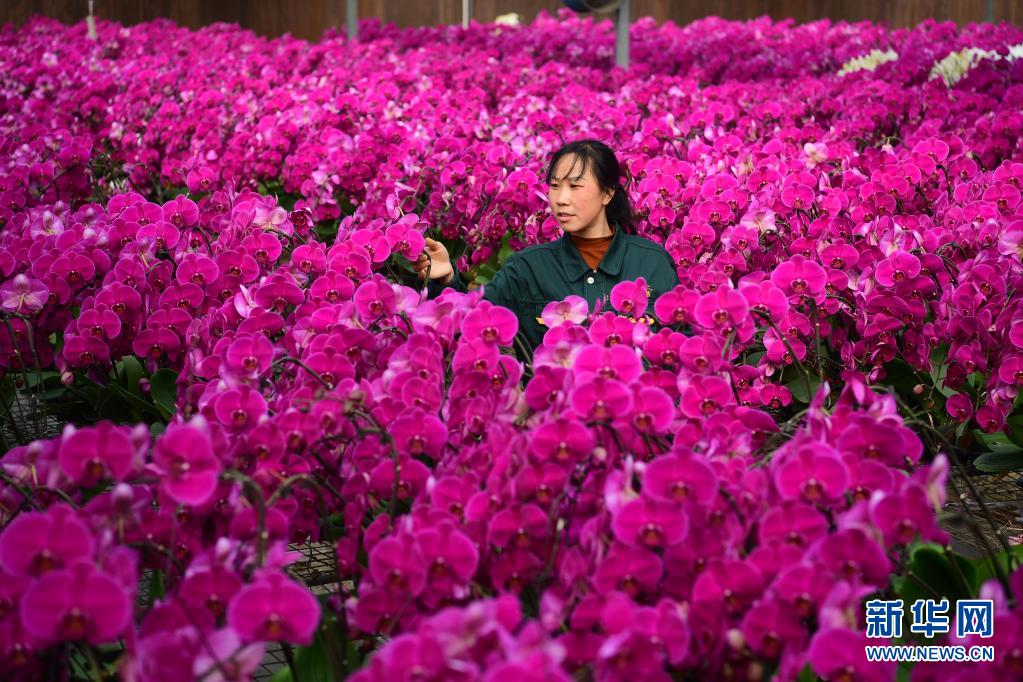 西安市长安区西安鲜花港的工作人员李丽在温室内查看蝴蝶兰(2018年3月9日摄)。新华社记者 邵瑞 摄