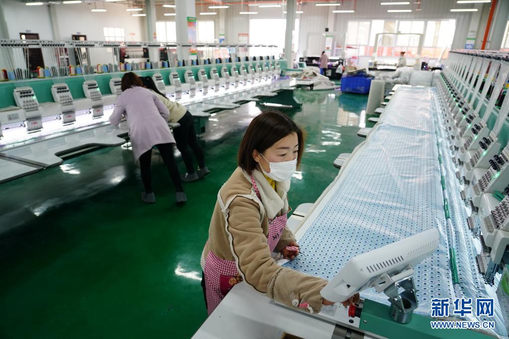 在陕西安康市汉滨区五里镇朝阳社区一家刺绣印花厂,社区工人在车间内工作(2020年3月5日摄)。新华社记者 邵瑞 摄