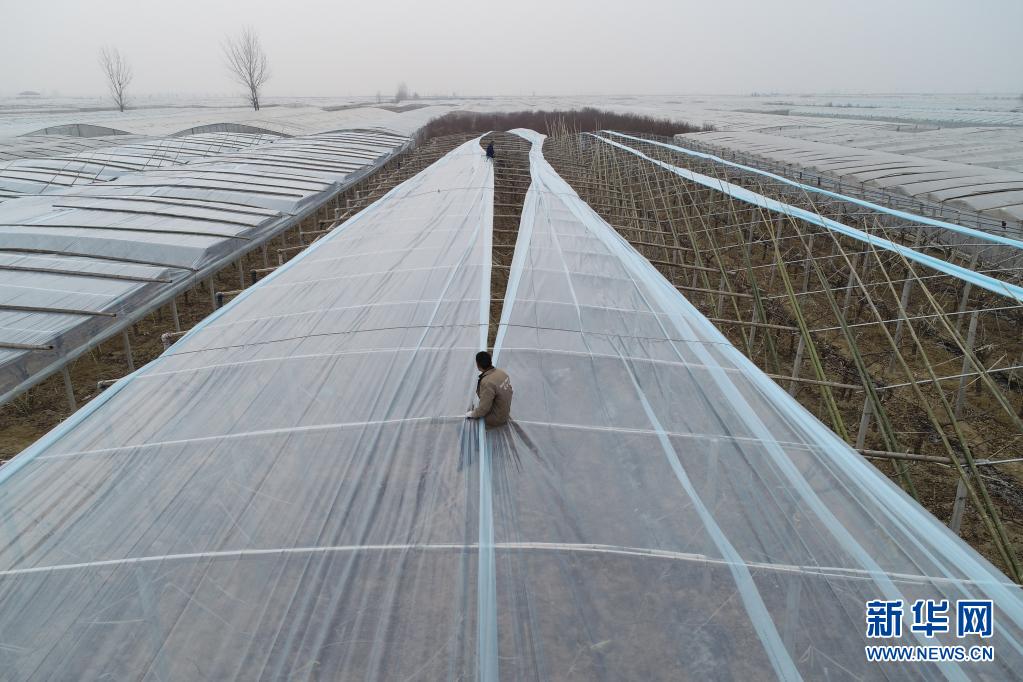 大荔县小坡村村民在防雨大棚上铺新塑料膜(2019年3月1日摄,无人机照片)。新华社记者 邵瑞 摄