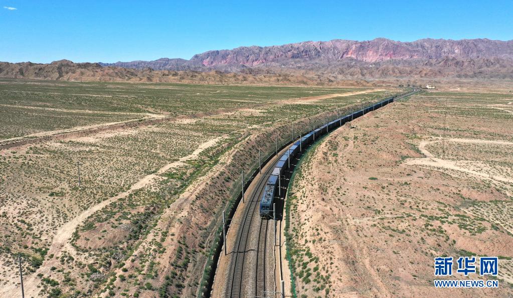 6月4日,一列火车驶过恢复通行的兰新铁路事发路段(无人机照片)。新华社记者 陈斌 摄