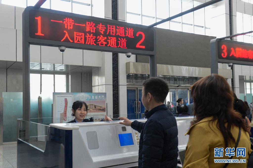 在中哈霍尔果斯国际边境合作中心入园大厅,霍尔果斯边检站的工作人员为游客办理手续(2019年3月22日摄)。新华社记者 丁磊 摄