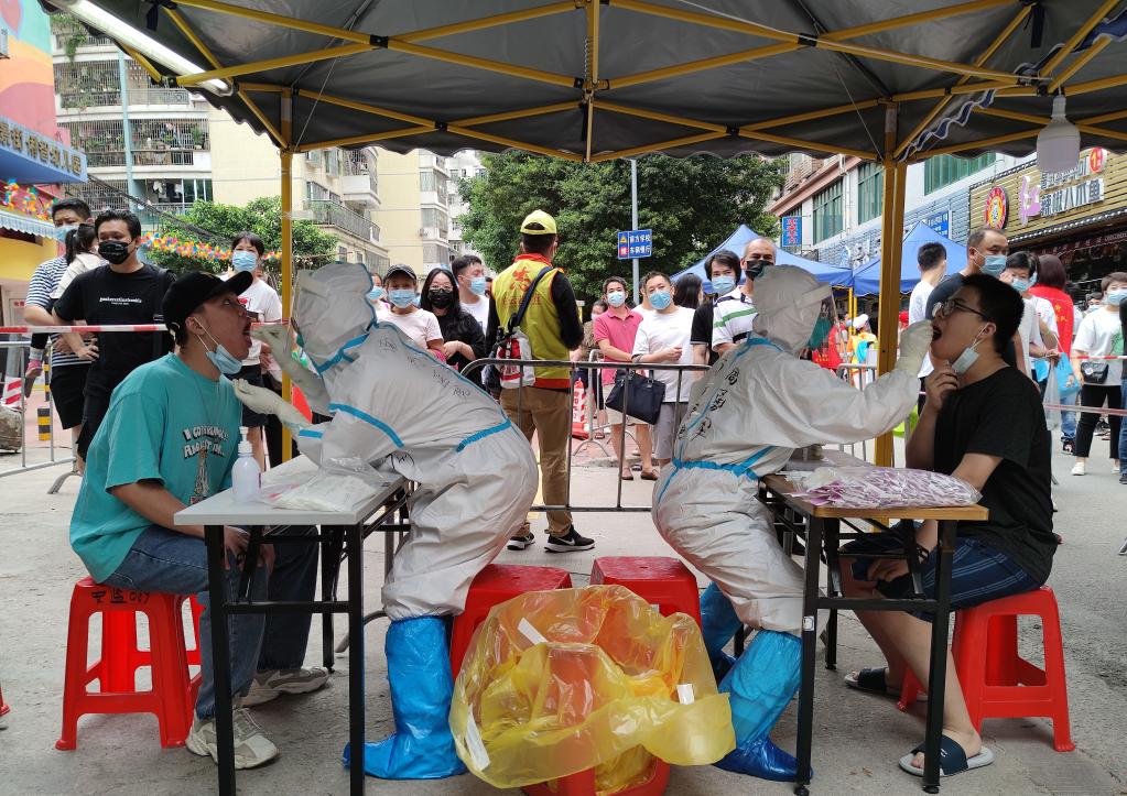 在这场与病毒的赛跑中,医护人员、社区志愿者、公安民警等都被紧急动员起来,广州市民也积极配合,按照指引完成核酸检测。