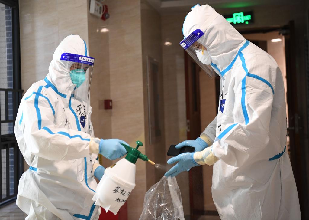 6月6日,在被列为高风险地区的广州荔湾区白鹤洞街道某小区,检测小组队员为队友喷洒消毒液。新华社记者 邓华 摄