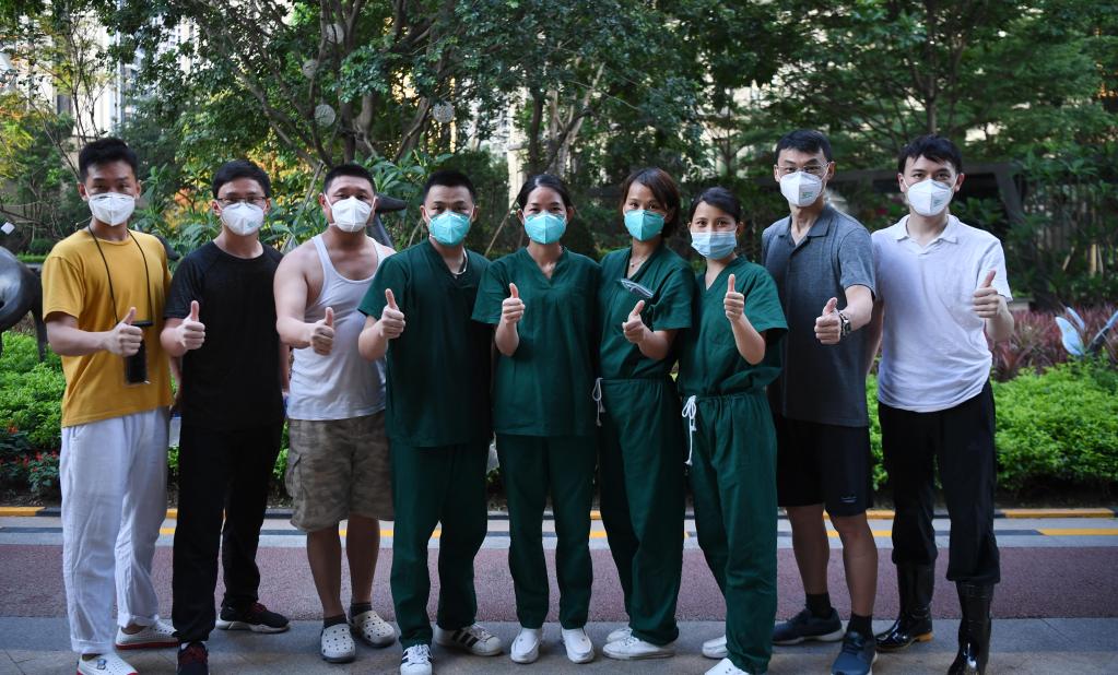 6月6日,在被列为高风险地区的广州荔湾区白鹤洞街道某小区,荔湾区人民医院的医务人员完成检测任务后和社区抗疫志愿者合影留念。新华社记者 邓华 摄
