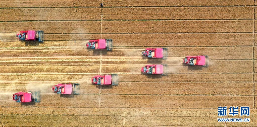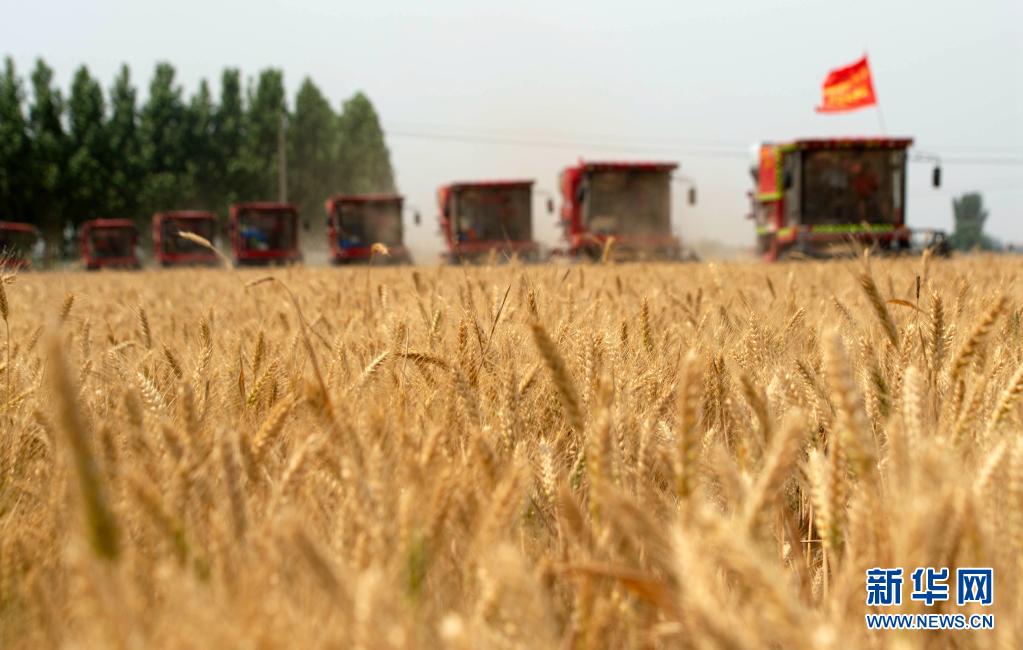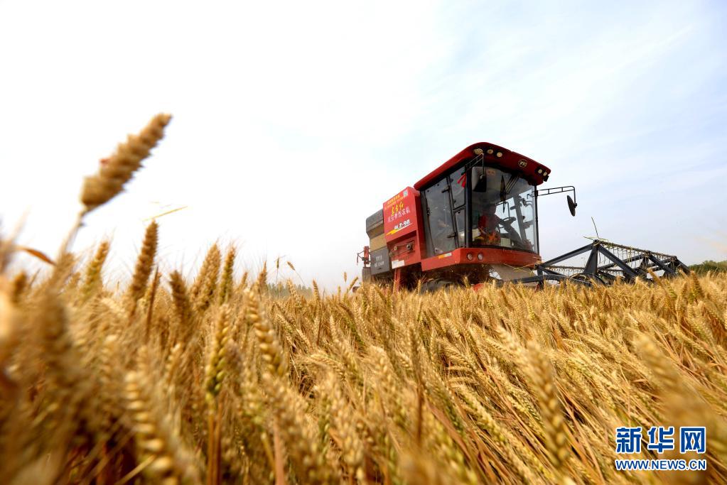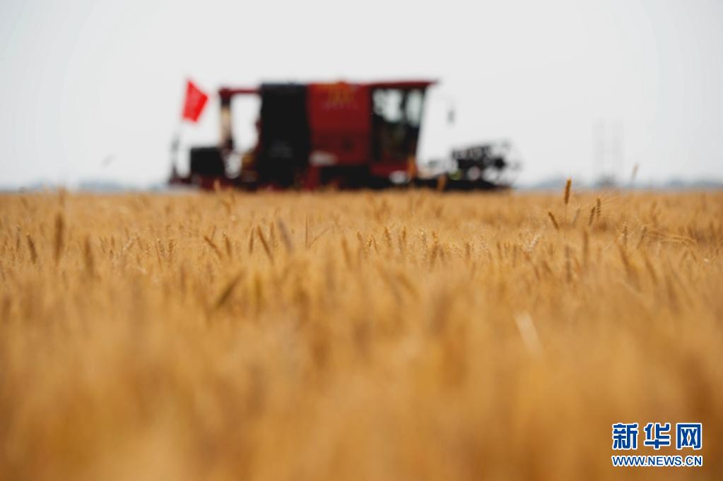 6月7日,联合收割机在邯郸市成安县俊山农机服务专业合作社的麦田里作业。新华社发(左小同 摄)