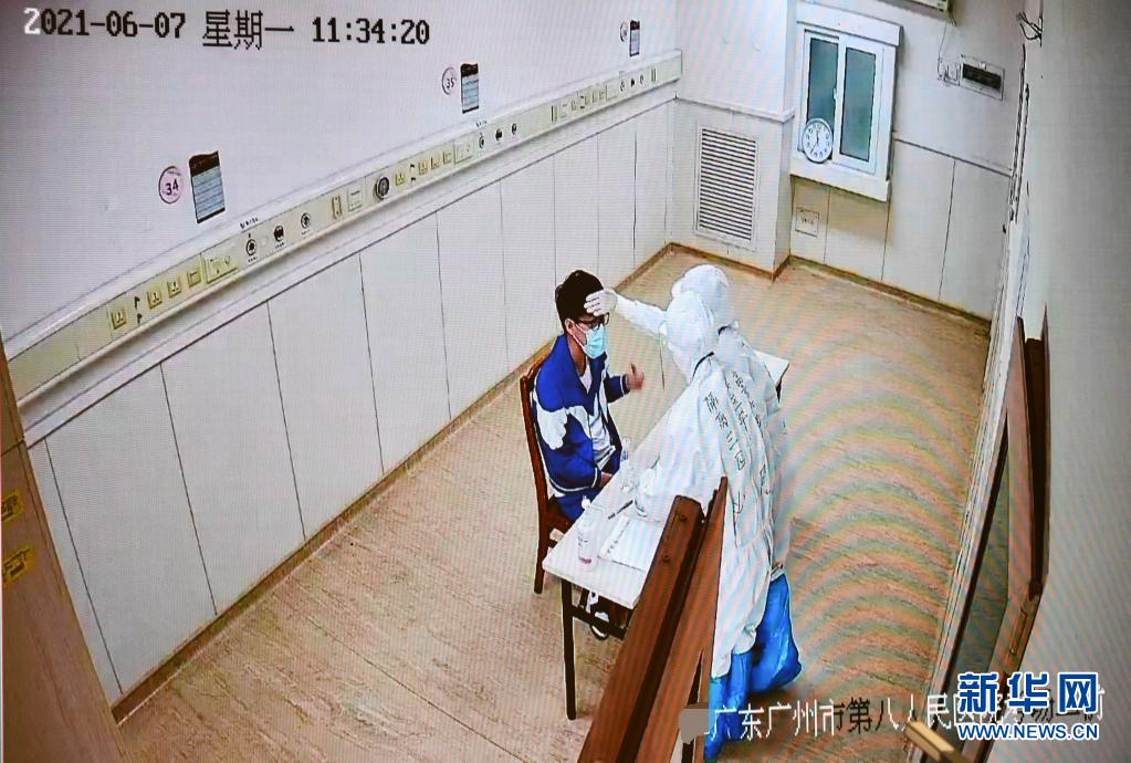 6月7日,广东省国家教育考试指挥中心的监控画面显示,上午语文考试结束后,广州市八医院嘉禾院区医护人员对隔离病房考生的试卷、答题卡、稿纸等用品进行消毒时,用手背为考生脑门探热。新华社记者 刘大伟 摄