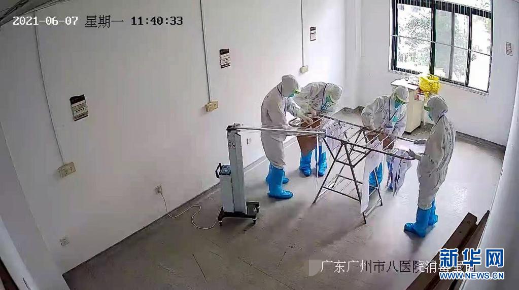 6月7日,广州市八医院嘉禾院区监控画面显示,医护人员对隔离病房考生的试卷、答题卡进行二次消毒。新华社发