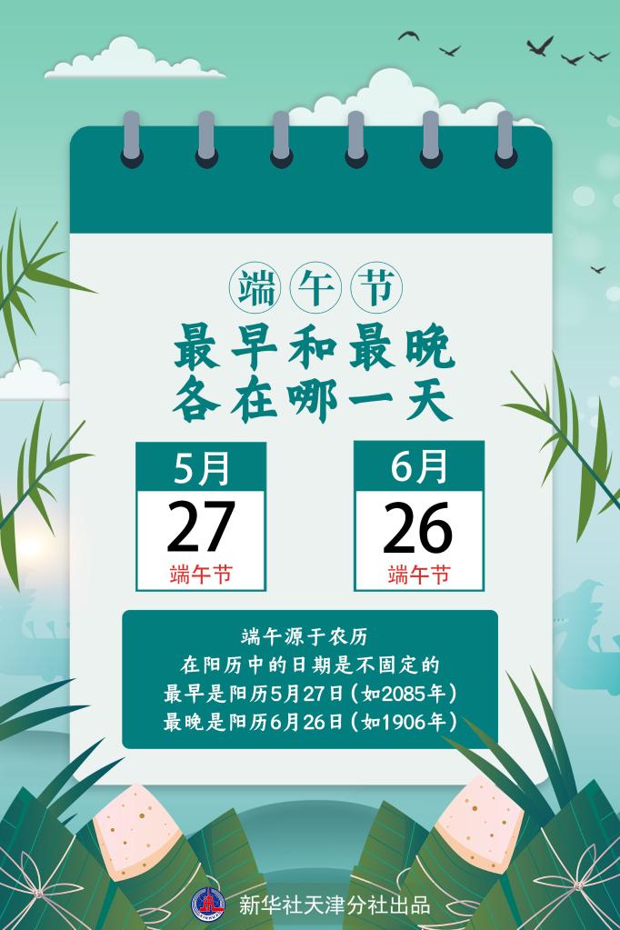 由于端午节源于农历,因此,它在阳历中的日期是不固定的。“对应阳历,最早是5月27日(如2085年),最晚是6月26日(如1906年)。因此,每年阳历5月27日至6月26日中的任何一天为端午节均属正常。”罗澍伟说。