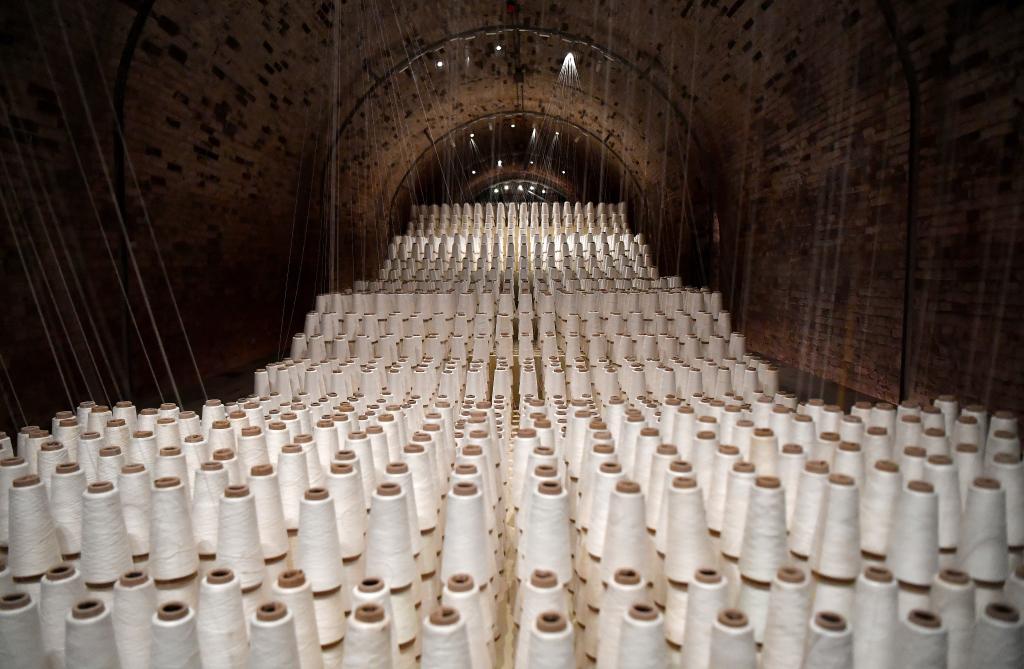 在陕西省宝鸡市金台区的长乐塬抗战工业遗址,其窑洞工厂最核心处有个“万枚纱锭进窑洞”的造型:上百枚纱锭为一组,线头聚拢伸向窑洞顶端。