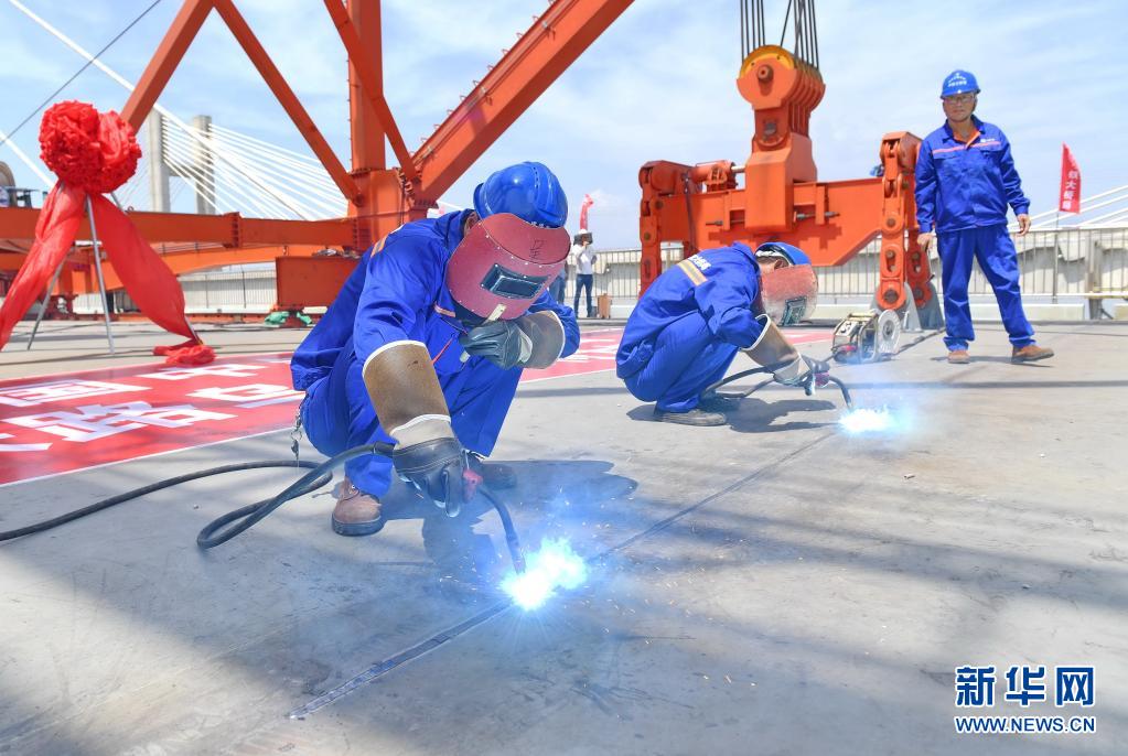 6月17日,中国中铁大桥局施工人员在新建福厦铁路乌龙江大桥合龙段进行精准焊接作业。新华社记者 林善传 摄