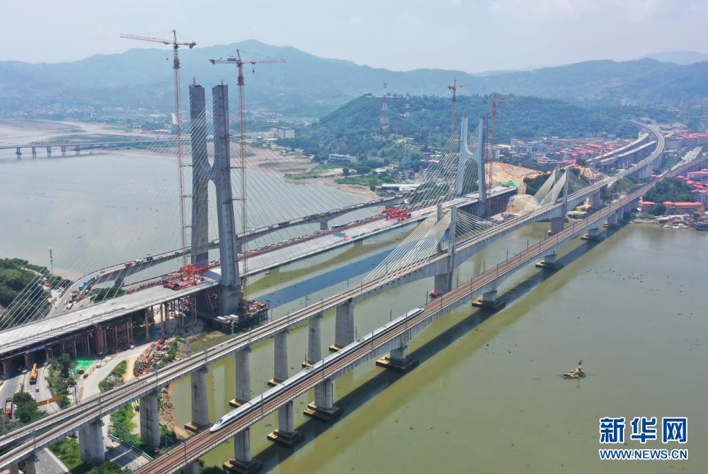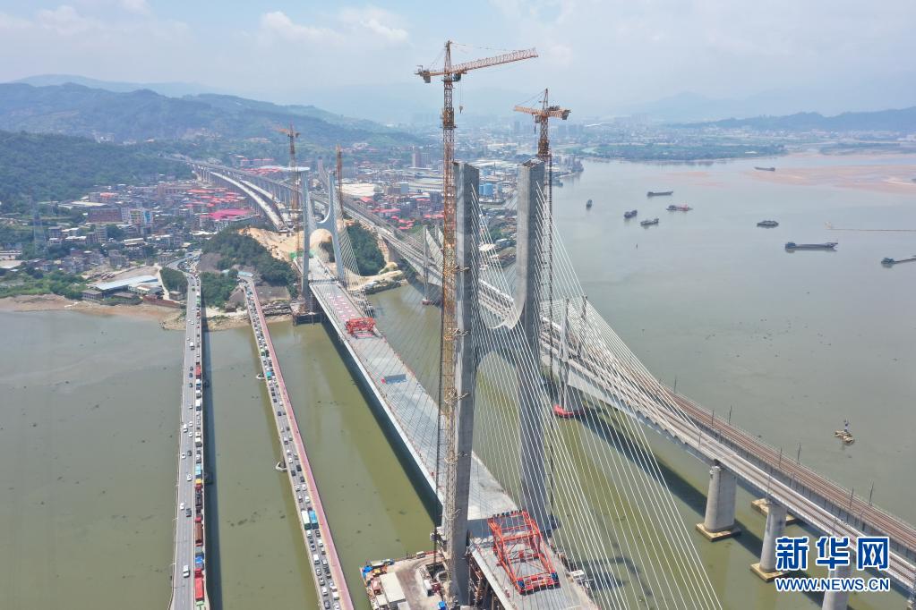 6月17日拍摄的顺利合龙的新建福厦铁路乌龙江大桥(右三,无人机照片)。新华社记者 林善传 摄