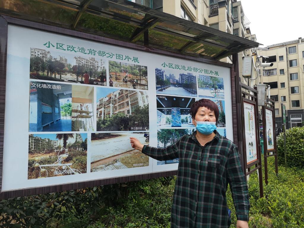 图为江西省九江市武宁县心怡水湾小区业主介绍小区改造前后变化(2020年4月14日摄)。 新华社记者 余贤红 摄