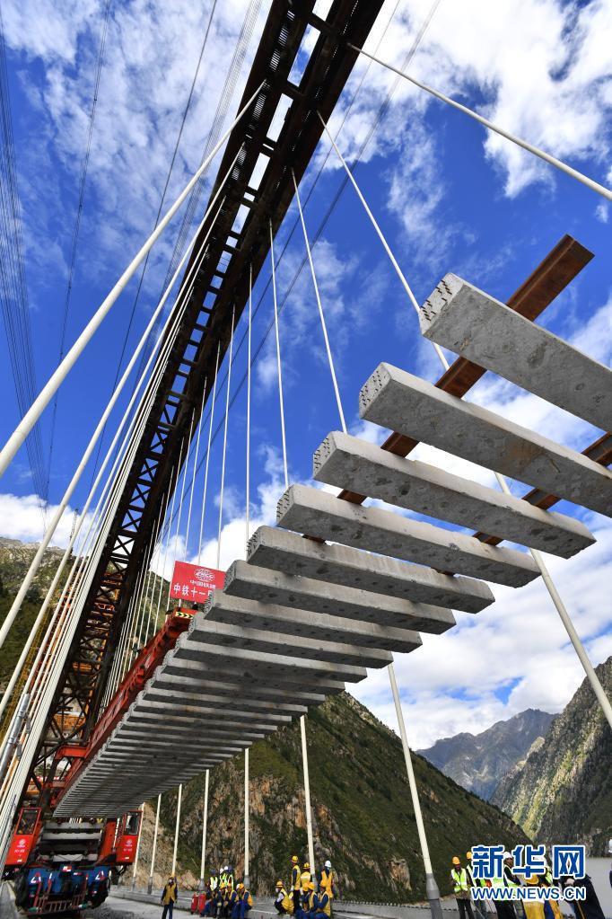 中铁十一局工程技术人员在拉林铁路藏木特大桥上铺轨(2020年9月20日摄)。新华社记者 觉果 摄