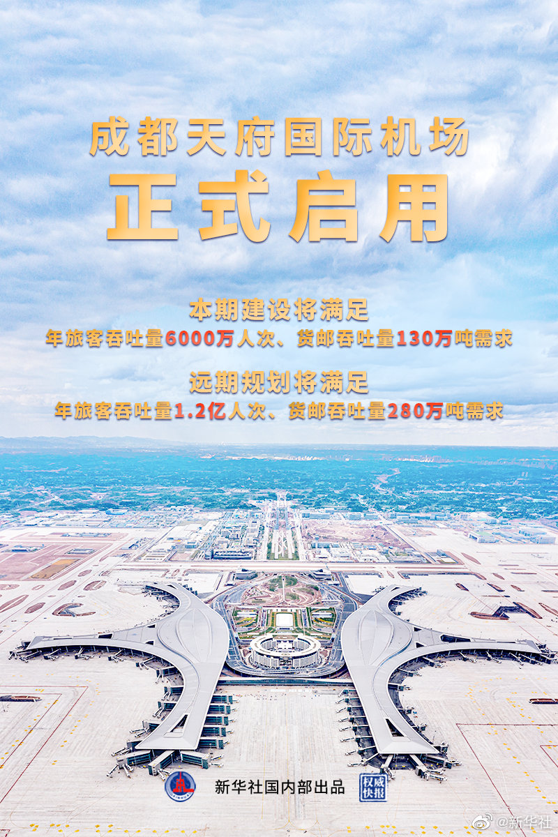 27日成都天府国际机场正式启用,这是国家“十三五”期间规划建设的最大民用运输枢纽机场。成都天府国际机场本期建设将满足年旅客吞吐量6000万人次、货邮吞吐量130万吨需求,远期规划将满足年旅客吞吐量1.2亿人次、货邮吞吐量280万吨需求,为成渝地区双城经济圈建设注入新的动力。(记者江毅、谢佼、李倩薇;摄影刘坤;海报设计杨轶群)