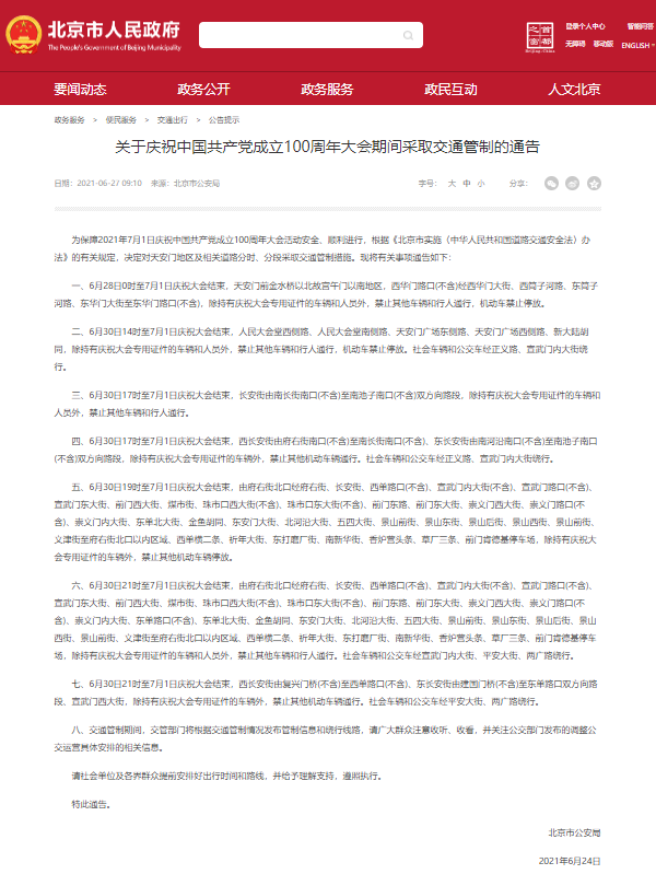 为保障2021年7月1日庆祝中国共产党成立100周年大会活动安全、顺利进行,根据《北京市实施〈中华人民共和国道路交通安全法〉办法》的有关规定,决定对天安门地区及相关道路分时、分段采取交通管制措施。现将有关事项通告如下: