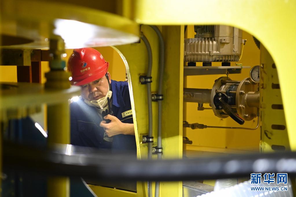 6月8日,在白鹤滩水电站左岸机房,工作人员在观察1号机组运转情况。新华社记者 胥冰洁 摄