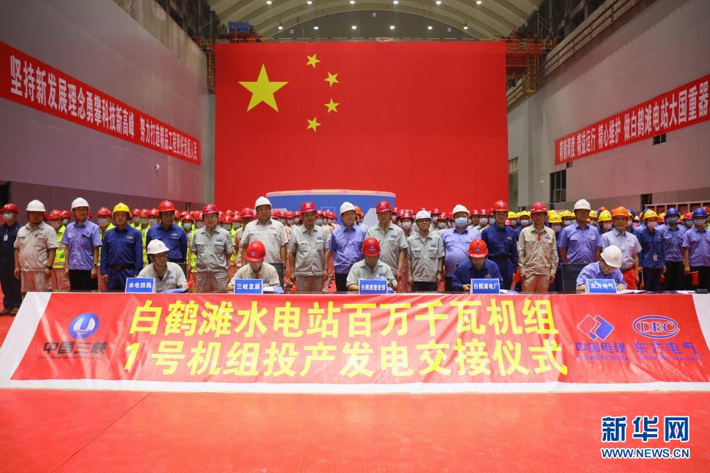 6月28日在白鹤滩水电站左岸地下厂房拍摄的白鹤滩水电站百万千瓦机组1号机组投产发电交接仪式。新华社发(中国电建水电四局供图)