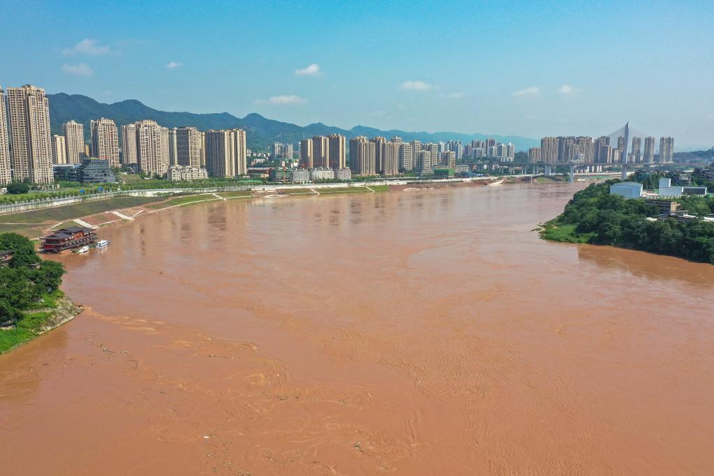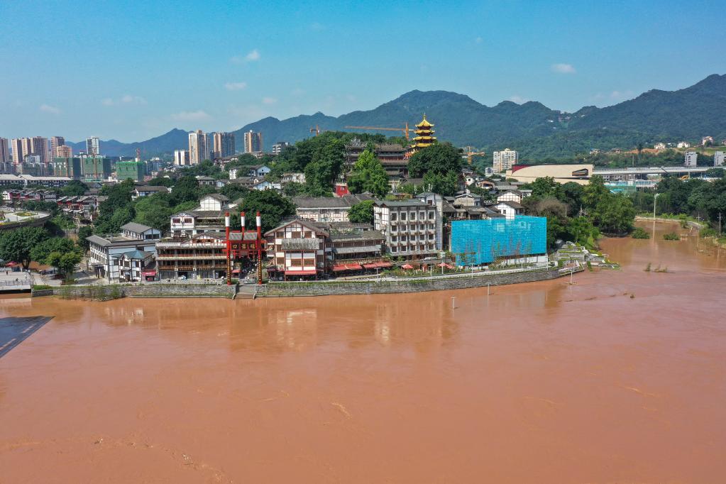 7月13日,嘉陵江洪水平稳通过重庆市沙坪坝区磁器口古镇(无人机照片)。(新华社记者黄伟 摄)