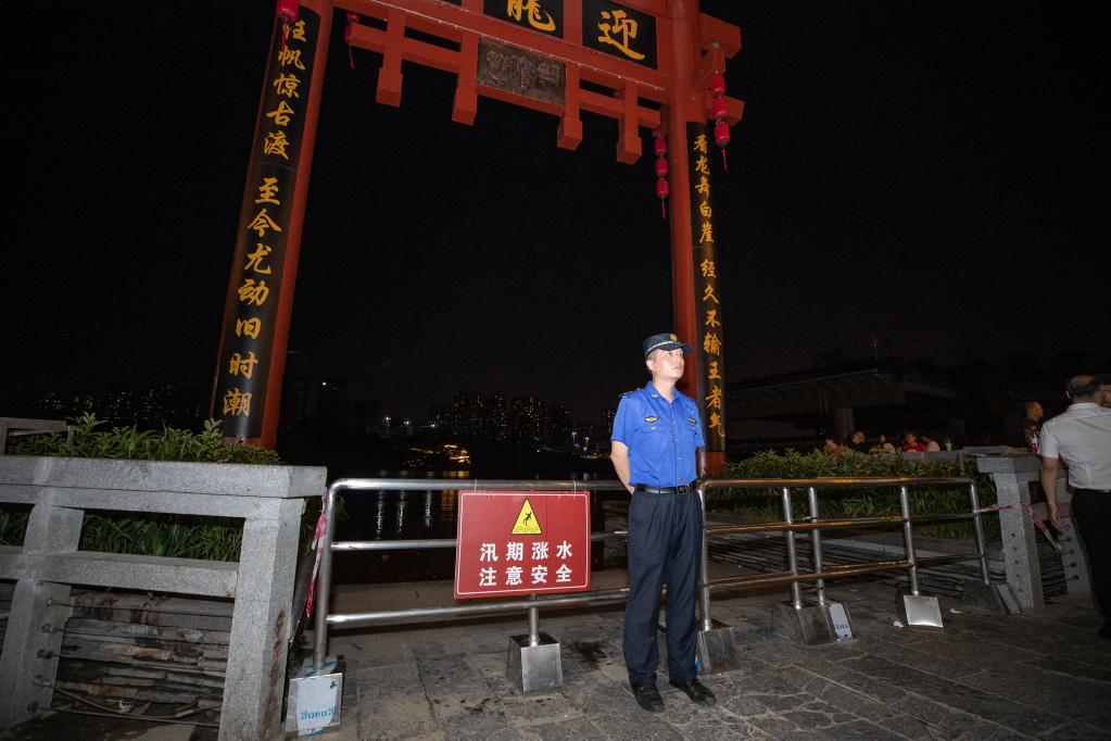7月12日晚,在重庆市沙坪坝区磁器口古镇,工作人员在嘉陵江沿江区域值守,确保过往人员安全。(新华社记者黄伟 摄)