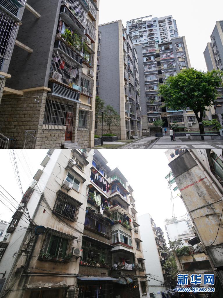 这张拼版照片的上图为7月19日拍摄的重庆市两江新区人和街道邢家桥社区改造后的居民楼(新华社记者 徐钦 摄);下图为重庆市两江新区人和街道邢家桥社区改造前的居民楼(资料照片)。新华社发