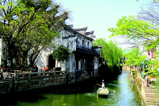 头顶蓝天白云,清澈的河水缓缓从眼前流过,房屋沿着河道铺陈开来,客栈饭馆、工艺作坊、小吃店铺,如珍珠般洒落其间。街道不时传来商贩的吆喝声,飘来美味佳肴的醇香味,用嘉兴人的话来说,“那是外婆家的味道”。