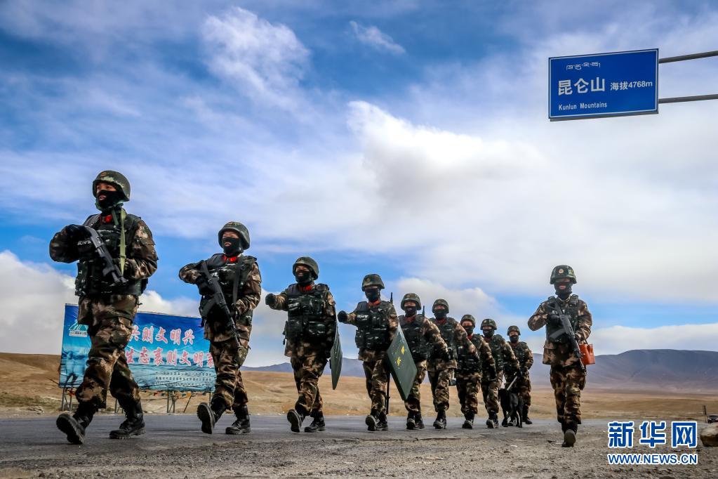 武警青海总队执勤支队执勤七中队官兵在昆仑山口巡逻(2月3日摄)。新华社发(杨浩 摄)